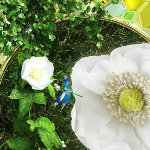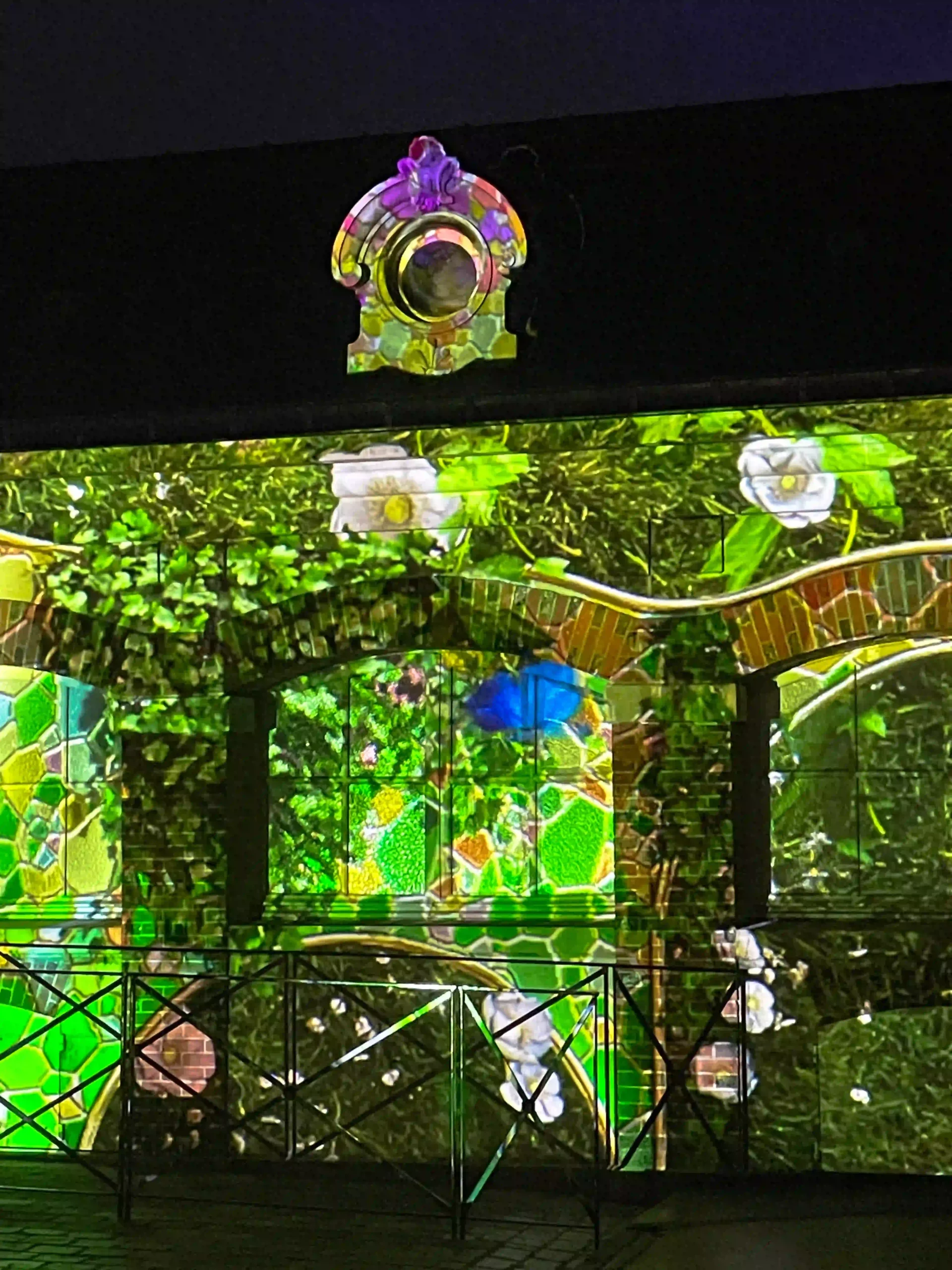 Le projet évolue avec la création d’un vidéo mapping inspiré de la campagne Be More Flower. La façade est transformée par une composition végétale lumineuse aux reflets iridescents, animée de papillons et de libellules. La projection s’étend également au sol, avec des reflets de voiles colorés qui prolongent la scénographie dans l’espace.