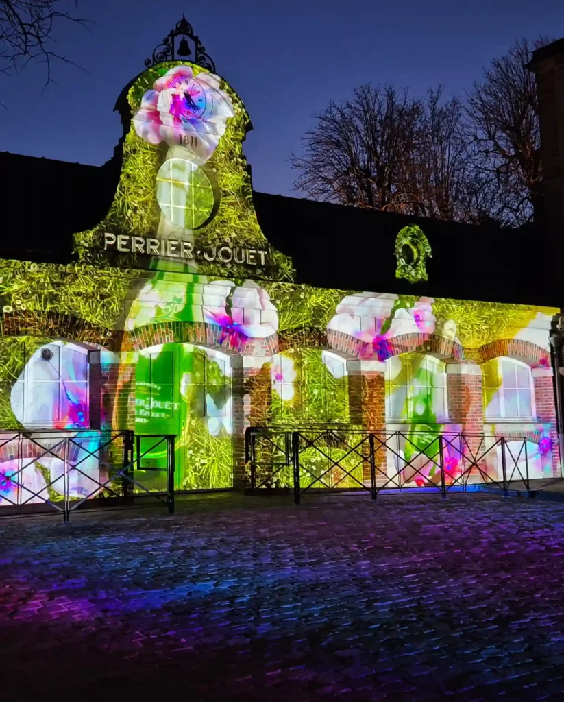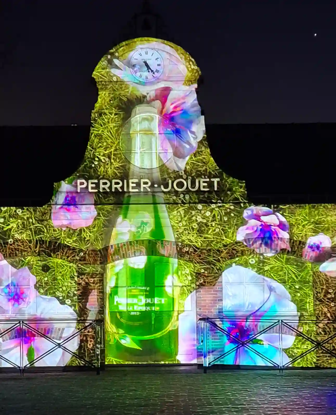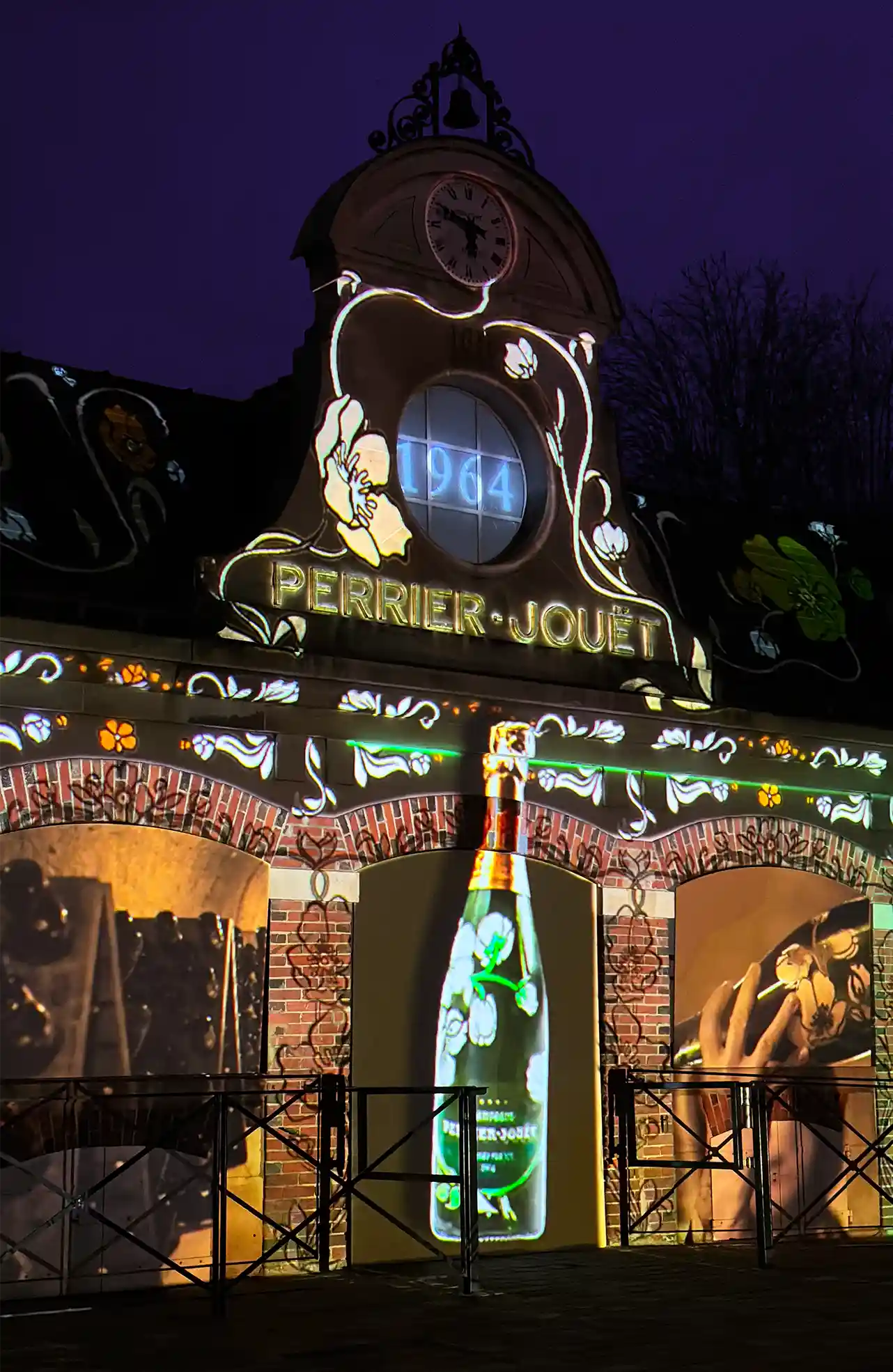 Depuis plusieurs années, nous avons le privilège d’accompagner la Maison Perrier-Jouët à Épernay lors de l’événement « Habits de Lumière ». À cette occasion, la façade emblématique du 26 avenue de Champagne se métamorphose et prend vie à travers un mapping vidéo sur mesure que nous concevons, révélant toute la poésie et l’excellence de la Maison.